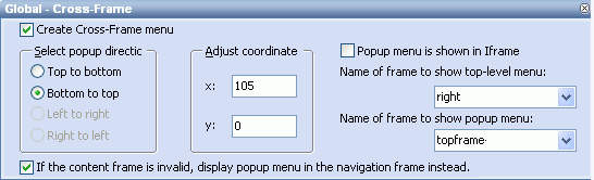 - Fill the left frame name "right" in the navigation frame box; and main frame name "topframe" in popup menu box.