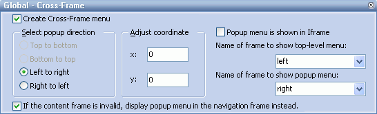 - Fill the left frame name "left" in the navigation frame box; and main frame name "right" in popup menu box.