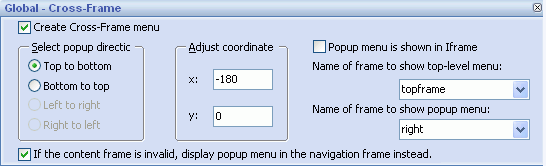 - Fill the top frame name "topframe" in the navigation frame box; and main frame name "right" in popup menu box.