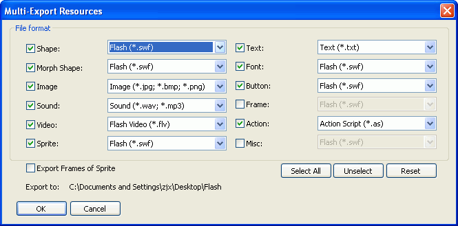 The frames included in sprite can be exported. - The exported file of font, button, frame, misc will be *.swf or *.fla file.