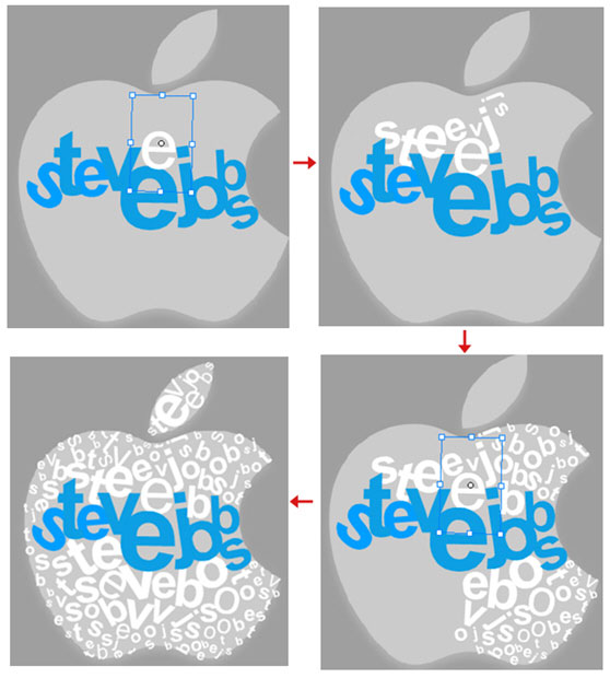 Select one letter to duplicate as mentioned above, but set color as "white" this time; Then modify its text as any letter from name Steve Jobs. Repeat this step to generate lots of letters to fill Apple logo, and set size and rotate angle as any you wish, but follow the rule of bigger size in the middle and smaller around gradually.