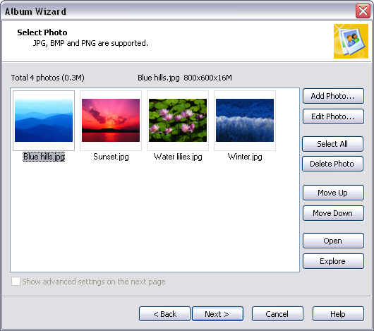 In this step, you can add photos to your album. The supported image formats are JPG, BMP, PNG and GIF.