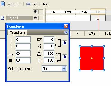 5. This is an important step-design a movie clip to drag picture pieces. That embedding a button into a movie clip is a way to use codes multiple times. Create a button symbol and name it button_body. In button-editing mode, insert a keyframe in Hit frame and use rectangle tool to draw a square about 80*80 and its position is (0, 0). Create a movie clip and name it button_action. In movie clip editing mode, drag “button_body” from library and set its coordinates as (0, 0).